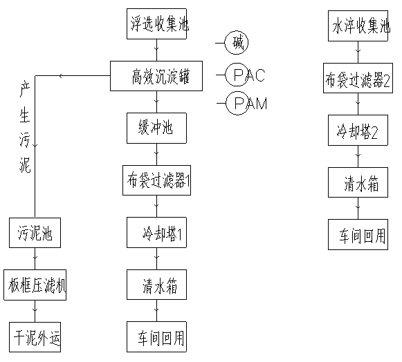 水淬廢水排入水淬收集池,然后泵入布袋過濾器去除SS后降溫,進入清水罐清水車間回用。浮選廢水排入浮選池,然后泵入高效混凝沉淀罐,固液分離后進入緩沖池,之后泵入布袋過濾器再次去除SS后降溫,進入清水箱清水車間回用。