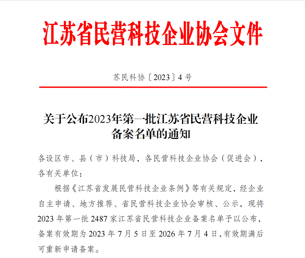導讀:近日,江蘇省民營科技企業協會公布了2023 年第一批江蘇省民營科技企業備案名單。經江蘇省民營科技企業協會的審查與認定,江蘇天達環保設備有限公司獲得“江蘇省民營科技企業”榮譽稱號。