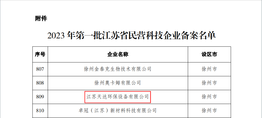 近日,江蘇省民營科技企業協會公布了2023 年第一批江蘇省民營科技企業備案名單。經江蘇省民營科技企業協會的審查與認定,江蘇天達環保設備有限公司獲得“江蘇省民營科技企業”榮譽稱號。
