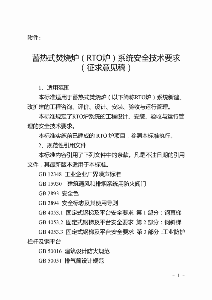 《蓄熱式焚燒爐(RTO爐)系統安全技術要求》適用于蓄熱式焚燒爐(以下簡稱RTO爐)系統新建、改擴建的工程咨詢、評價、設計、安裝、驗收與運行管理,同時要求本標準實施前已建成的RTO爐項目,參照執行。此標準將規定RTO爐系統的工程設計、安裝、驗收與運行管理的安全技術要求。